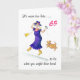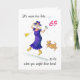 A lighthearted, encouraging 65th Birthday Card with a woman dancing and singing with a little dog, from a pen and wash illustration by Judy Adamson. The front cover text is a well-known George Eliot quotation.