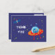 This boy's birthday party thank you postcard has an alien space theme. There is a ufo flying in outerspace with a satellite and stars floating all around. You can easily customise this with your thank you message on the back. Graphics by Blackleaf Studios at MyGrafico