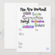 We've taken the word "Graduation" and used a lot of different fonts and hues to give it some design. Where you see the word "Party" you can keep it there. Or replace it with the Graduate's name. Or the Year (i.e. this year). Then fill out the other areas. TO CUSTOMIZE: To change the fonts, click the "F" box and a drop down menu with lots of options will appear. To change font colours, click the black box and a drop down menu will appear with lots of colours. To size the fonts click the + or - numerical buttons. To move text around, use the arrow keys. Or, on top left click "Design" mode and your mouse will be able to move things more intricately. NOTE: THIS DESIGN DOES NOT WORK ON ALL INVITATION SIZES!!!