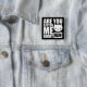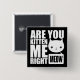 Cool fun text design button with words saying Are You Kitten Me Right Meow and with a cute kawaii kitten face. White text on a black background.