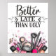Fun self-ironic poster for makeup lovers, featuring the caption "Better late than ugly", in black modern typography, decorated with a beautiful illustration of cosmetic products.