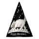 This personalised party hat is black with white music notes with a fun Happy white cat walking on piano keys. Customise the Happy Birthday text with the template.