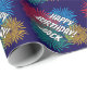 Fun Birthday wrapping paper with fireworks print. Personalised wrapping paper for celebrations. Cheerful design with custom name. Customisable background colour. Available in matte and glossy.