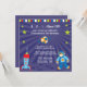 This 5.25x5.25 boy's birthday party invitation has a space rocket theme. There is a rocket flying and an astronaut with a moon and stars floating all around. You can easily customise this with your party information in the middle. Graphics by Blackleaf Studios at MyGrafico
