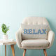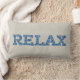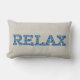 A fun lumbar pillow with the word 'RELAX' in letters filled with a blue and green floral pattern on a hessian-colored (burlap) background.