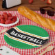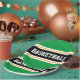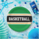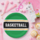 This sporty design features bold BASKETBALL text inside a wide black horizontal centre racing stripe highlighted with twin floating white pinstripes against bright kelly green outer stripes. The text can be personalised.