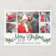 Modern Fun Calligraphy Script 5 Photo Couple Photo Collage Merry Christmas Postcard includes Watercolor Christmas Holly Berries - Green Script