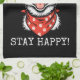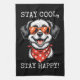 A cheerful cartoon dog with a big smile, orange sunglasses, and a red paw-print bandanna stands against a black background. Bold white text reads "STAY COOL, STAY HAPPY!" for a fun, uplifting vibe.