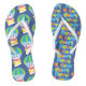 One side of these cute novelty flip flops have an image pattern of a cow descending the skies in a parachute. The other side has colourful typography that repeats "Don't Have a Cow". Colours used include blue, gold, red, and lime green. Fun, and kind of crazy! *This design uses artwork owned by Encore Software, Inc., which grants use to its licensors. All rights reserved.