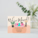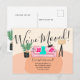 We have moved! A cute and fun quirky illustration of a living room with a pink sofa, pillow, lamp, house plant and a cat, with a teal trow blanket and a knitting kit moving announcement and an elegant and modern script calligraphy typography. The wall floor and rug colours are all fully editable and moveable!
