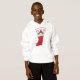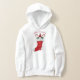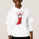 This child's hooded sweatshirt has a fun little gnome with a dark red pointy hat inside a red and white Christmas stocking between two candy canes and green holly leaves. Customise the Merry Christmas text with the template.