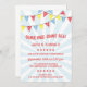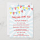 This fun circus-themed kids birthday party invitation features colourful patterned bunting, red text, and a light blue starburst in the background.