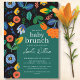 Modern baby shower brunch design featuring big bold colourful flowers in orange yellow and blue with a modern arch showcasing your party info.