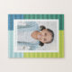 A fun and colourful stripe pattern in shades of blues and greens surrounds a single vertical photo with custom text. This photo gift is perfect for all ages - from kids to grandparents to commemorate a fun photo or event.