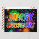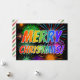 This fun, colourful Christmas themed card design features the message "MERRY CHRISTMAS!" having a rainbow inspired spectrum gradient pattern. It also features a vibrant and multicolored bursting fireworks inspired pattern. The back features a customisable Christmas greeting message, along with a white, red and green striped pattern background. Cards like this might be a fun way to send Christmas wishes to friends and family.