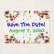 Vivid, colourful dots and swirls bursting every which way with "Save The Date! and the date in the middle makes this a fun and unique card. Personalise this colourful and festive invitation card with the date for the party and put your custom info on the back, or you can even just delete the text if you don't want it. Great also for name tags, badges, gift tags, bookmarks, labels, table place cards, birthday parties, reunions, company parties, thank you cards, and anytime you need a colourful, cheerful, attention-getting custom card. Shown is the chubby size card. Two other sizes are available. Get some and get ready for the fun!