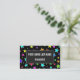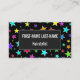 This fun, multicolored business card design features a pattern of star shapes of various sizes and coloured a variety of colours on a black background. The front also features a dark-coloured rectangular shaped area containing a name and a profession/role/title/position that can both be customised. The back features a simple design including a name, a profession/role/title/position, and contact information that can be personalised. This business card design could be used by a professional, or perhaps by a small business owner. [~Z0000061]