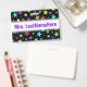 This fun, multicolored badge design features a pattern of star shapes of various sizes and coloured a variety of colours on a black background. It also features a personalised name in purple coloured text within a white coloured area. A badge like this could perhaps be worn by a teacher, educator, tutor or professor during the early weeks of a school year or a course. It might help the students learn and remember their teacher’s name. [~Z0000175]