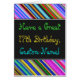 This fun, colourful and whimsical birthday-themed greeting card design features a warm birthday wish like "Have a Great 17th Birthday, Custom-Name!" on the front. The name on the front can be customised. The top and bottom of the front feature a vibrant, multicolored stripe pattern. The inside features a birthday message that can be customised. A greeting card like this could be a fun way to deliver birthday wishes to somebody who is celebrating their seventeenth birthday. [~Z0000269]