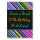 This fun, colourful and whimsical birthday-themed greeting card design features a warm birthday wish like "Have a Great 50th Birthday, First-Name!" on the front. The name on the front can be personalised. The top and bottom of the front feature a vibrant, multicolored stripe pattern. The inside features a birthday message that can be personalised. A greeting card like this could be a fun way to deliver birthday wishes to somebody who is celebrating their fiftieth birthday. [~Z0000269]