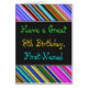 This fun, colourful and whimsical birthday-themed greeting card design features a warm birthday wish like "Have a Great 8th Birthday, First-Name!" on the front. The name on the front can be personalised. There are also multicolored stripes at the top and bottom of the front. The inside features a customisable birthday message. A greeting card like this could be a fun way to deliver birthday wishes to somebody who is celebrating their eighth birthday. [~Z0000269]