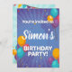 Fun balloon birthday party invitation with streamers, confetti and balloons. Filled with fun colors of teal, orange, red and purple which makes it great for any gender.