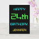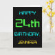 This simple and fun birthday greeting card design features a message like "HAPPY 24th BIRTHDAY, JENNIFER!". It also features a fun appearance inspired by digital computing. The name on the front and the message on the inside can be customised. It could be sent or given to somebody who is celebrating their twenty fourth birthday, and who perhaps works (or worked prior to retirement) as a computer programmer, a software developer, a database administrator, a network administrator, an electronics engineer, or who otherwise enjoys using computers. [~Z0000100]