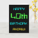 This simple and fun birthday greeting card design features a message like "HAPPY 40th BIRTHDAY, ANDREW!". It also features a fun look inspired by digital computing. The name on the front and the message on the inside can be personalised. It could be sent or given to somebody who is celebrating their fortieth birthday, and who perhaps works as a computer system administrator, a computer programmer, a network administrator, an electrical engineer, a software developer, or who otherwise enjoys using computers. [~Z0000100]