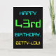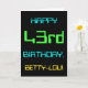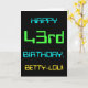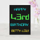 This simple and fun birthday greeting card design features a message like "HAPPY 43rd BIRTHDAY, BETTY-LOU!". It also features a fun appearance inspired by digital computing. The name on the front and the message on the inside can be customised. It could be sent or given to somebody who is celebrating their forty third birthday, and who perhaps works (or worked prior to retirement) as a database administrator, a computer programmer, a network administrator, a software developer, an electrical engineer, or who otherwise enjoys using computers. [~Z0000100]