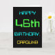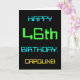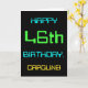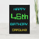 This simple and fun birthday greeting card design features a message like "HAPPY 46th BIRTHDAY, CAROLINE!". It also features a fun look inspired by digital computing. The name on the front and the message on the inside can be personalised. It could be sent or given to somebody who is celebrating their forty sixth birthday, and who perhaps works (or worked prior to retirement) as a computer programmer, a software developer, a database administrator, a network administrator, an electronics engineer, or who otherwise enjoys using computers. [~Z0000100]