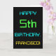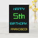 This simple and fun birthday greeting card design features a message like "HAPPY 5th BIRTHDAY, FRANCISCO!". It also features a fun appearance inspired by digital computing. The name on the front and the message on the inside can be customised. It could be sent or given to somebody who is celebrating their fifth birthday, and who perhaps works as a computer system administrator, a computer programmer, a network administrator, an electrical engineer, a software developer, or who otherwise enjoys using computers. [~Z0000100]