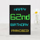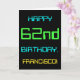 This simple and fun birthday greeting card design features a message like "HAPPY 62nd BIRTHDAY, FRANCISCO!". It also features a fun appearance inspired by digital computing. The name on the front and the message on the inside can be personalised. It could be sent or given to somebody who is celebrating their sixty second birthday, and who perhaps works (or worked prior to retirement) as a computer programmer, a software developer, a database administrator, a network administrator, an electronics engineer, or who otherwise enjoys using computers. [~Z0000100]
