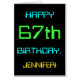 This simple and fun birthday greeting card design features a message like "HAPPY 67th BIRTHDAY, JENNIFER!". Its appearance is inspired by the field of digital computing. The name on the front and the message on the inside can be customised. It could be sent or given to somebody who is celebrating their sixty seventh birthday, and who perhaps works (or worked prior to retirement) as a computer system administrator, a computer programmer, a network administrator, an electrical engineer, a software developer, or who otherwise enjoys using computers. [~Z0000100]