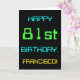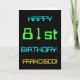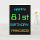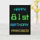 This simple and fun birthday greeting card design features a message like "HAPPY 81st BIRTHDAY, FRANCISCO!". It also features a fun look inspired by digital computing. The name on the front and the message on the inside can be personalised. It could be sent or given to somebody who is celebrating their eighty first birthday, and who perhaps works (or worked prior to retirement) as a computer programmer, a software developer, a database administrator, a network administrator, an electronics engineer, or who otherwise enjoys using computers. [~Z0000100]