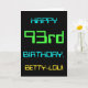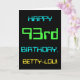 This simple and fun birthday greeting card design features a message like "HAPPY 93rd BIRTHDAY, BETTY-LOU!". It also features a fun appearance inspired by digital computing. The name on the front and the message on the inside can be customised. It could be sent or given to somebody who is celebrating their ninety third birthday, and who perhaps works (or worked prior to retirement) as a database administrator, a computer programmer, a network administrator, a software developer, an electrical engineer, or who otherwise enjoys using computers. [~Z0000100]