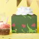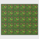 Fun dinosaur elf Christmas Wrapping Paper for kids. Personalised T-rex dino gift wrap with custom name of child. Funny design with prehistoric dinosaur wearing an elf hat while throwing Christmas trees around. Green or custom background colour. Available in matte and glossy rolls. Cool illustration for boys who are crazy about Jurassic animals.