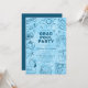 Make a splash with this fun pool party graduation invitation! Featuring a vibrant blue background and playful hand-drawn doodles, this design includes all the perfect summer and graduation elements—an inflatable flamingo, grad cap, swimwear, ice lolly, books, flip flops, swim bag, and sunshine.