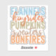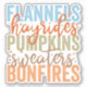 This vibrant and textured fall design highlights the quintessential elements of the autumn season with the words "Flannels," "Hayrides," "Pumpkins," "Sweaters," and "Bonfires." Each word is displayed in bold, uppercase letters, with a weathered texture that gives the design a rustic, vintage feel. The colour palette includes cool blues, warm oranges, earthy greens, and soft browns, capturing the diverse colours of fall. The words "hayrides" and "sweaters" are written in a flowing, cursive script that contrasts beautifully with the blocky text, adding a touch of elegance and movement to the design. Tiny star accents are scattered around the text, adding an extra layer of charm and playfulness.