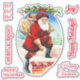 Illustration from Victorian era Christmas: Santa Claus stepping into a house chimney with bag of gifts and holly with ribbon with a set of seasonal greetings that can be used as separate stickers: Joy! Ho Ho Ho! Merry & Bright, Happy Holidays! Merry Christmas Happy Christmas