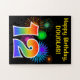 This fun, vibrant puzzle design features a colourful pattern inspired by celebratory fireworks, along with the number "12" having a multicolored rainbow like gradient pattern, on a black coloured background. It also features a customisable name and event message, such as a birthday greeting. A puzzle like this might be a fun way to send a greeting message in celebration of somebody’s twelfth birthday. [~Z0000329]