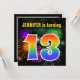 This fun, vibrant birthday party invitation design features a colourful pattern inspired by bursting celebratory fireworks, along with the number "13" having a multicolored rainbow inspired spectrum or gradient pattern. The name on the front can be customised. The back features personalised information about the party. Birthday party invitations like this might be sent to potential guests for a birthday party being held to celebrate somebody’s thirteenth birthday. [~Z0000337]
