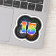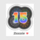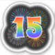 This fun, exciting sticker design features a colourful pattern inspired by bursting celebratory fireworks, along with the number "15" featuring a multicolored rainbow like spectrum or gradient pattern. A sticker like this might be fun to use when celebrating somebody’s fifteenth birthday, or perhaps a couple’s fifteenth wedding anniversary, or some other 15th event. [~Z0000362]