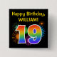 This fun, vibrant button design features a colourful bursting celebratory fireworks inspired pattern, along with the number "19" having a multicolored rainbow like spectrum or gradient pattern. It also features a personalised name and event message, such as a "Happy Birthday" birthday greeting. A button like this might be worn by the guests at a birthday party being held in celebration of somebody’s nineteenth birthday. [~Z0000334]
