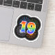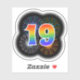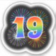 This fun, exciting sticker design features a colourful bursting celebratory fireworks inspired pattern, along with the number "19" featuring a multicolored rainbow inspired spectrum or gradient pattern. A fun sticker like this might be used when celebrating somebody’s nineteenth birthday, or perhaps a couple’s nineteenth wedding anniversary, or some other 19th event. [~Z0000362]