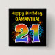 This fun, vibrant button design features a colourful bursting celebratory fireworks inspired pattern, along with the number "21" featuring a multicolored rainbow inspired spectrum or gradient pattern. It also features a customisable name and event message, such as a "Happy Birthday" birthday greeting. A button like this might be worn by the guests at a birthday party being held in celebration of somebody’s twenty first birthday. [~Z0000334]
