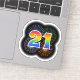 This fun, vibrant sticker design features a colourful bursting celebratory fireworks inspired pattern, along with the number "21" featuring a multicolored rainbow like spectrum or gradient pattern. A sticker like this might be used when celebrating somebody’s twenty first birthday, or perhaps a couple’s twenty first wedding anniversary, or some other 21st event. [~Z0000362]