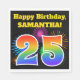 This fun, vibrant paper napkin design features a colourful pattern inspired by celebratory fireworks, along with the number "25" featuring a multicolored rainbow like gradient pattern, on a black coloured background. It also features a personalised name and event message. Paper napkins like this could perhaps be used at a birthday party being held to celebrate somebody’s twenty fifth birthday. [~Z0000326]