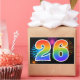 This fun, vibrant sticker design features a colourful pattern inspired by celebratory fireworks, along with the number "26" having a multicolored rainbow inspired gradient pattern, on a black coloured background. Stickers like this might be used at a party celebrating somebody’s twenty sixth birthday, or perhaps for a couple’s twenty sixth wedding anniversary, or some other 26th event. [~Z0000324]