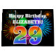This fun, vibrant gift bag design features a colourful celebratory fireworks inspired pattern, along with the number "29" having a multicolored rainbow inspired gradient pattern, on a black coloured background. It also features a customisable name and event message, such as a birthday greeting. A colourful and joyful gift bag like this might be used when giving a gift or present to somebody who is celebrating their twenty ninth birthday. [~Z0000328]