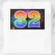 This fun, vibrant sticker design features a colourful celebratory fireworks inspired pattern, along with the number "32" featuring a multicolored rainbow like gradient pattern, on a black coloured background. Stickers like this might be given as a small gift while celebrating somebody’s thirty second birthday, or perhaps for a couple’s thirty second wedding anniversary, or some other 32nd event. [~Z0000324]